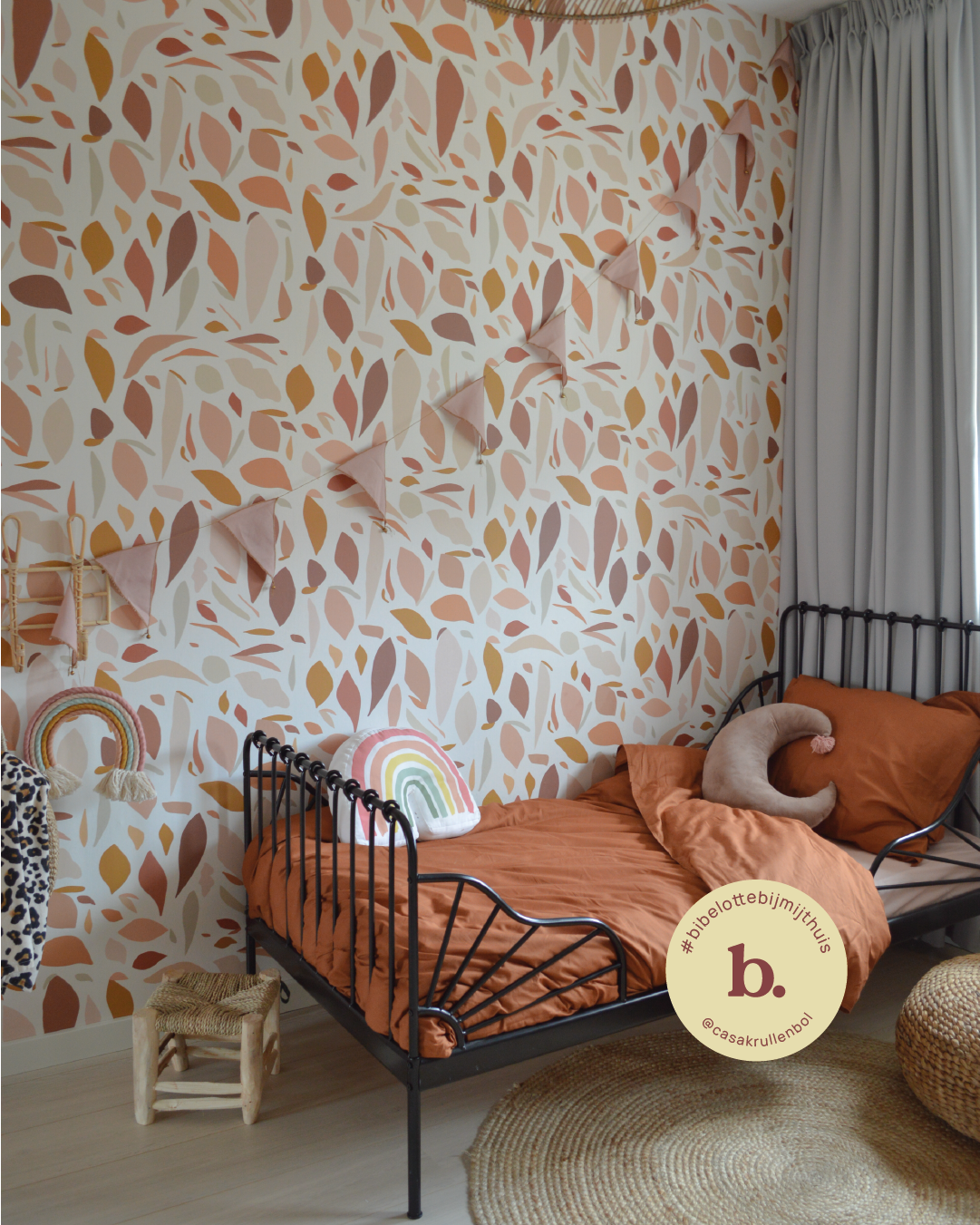 Pears, lemons, bananas... Anyone who takes a close look at this colorful, graphic wallpaper can see shapes of fruit in it. In a beautiful palette of nude, pink, and rust tones.